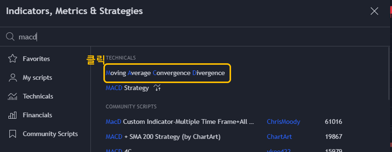 - 다시 왼쪽 Indicators 검색란에 MACD를 검색 후 클릭해주세요
