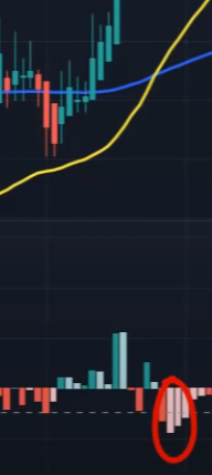 3) (롱포지션 예) - 이동 평균 수렴 확장 지수(MACD)에 아래의 그림과 같이 큰 아래 캔들이 생기면 상승할때 생기는 녹색 캔들이 나올때를 기다린다.