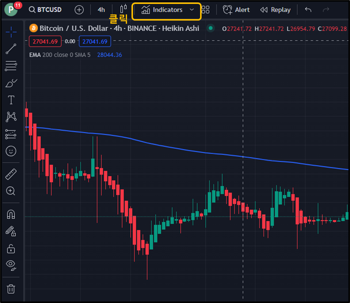 - 하이킨 애쉬 캔들, EMA50, EMA 200, MACD 총 4가지를 설정한다