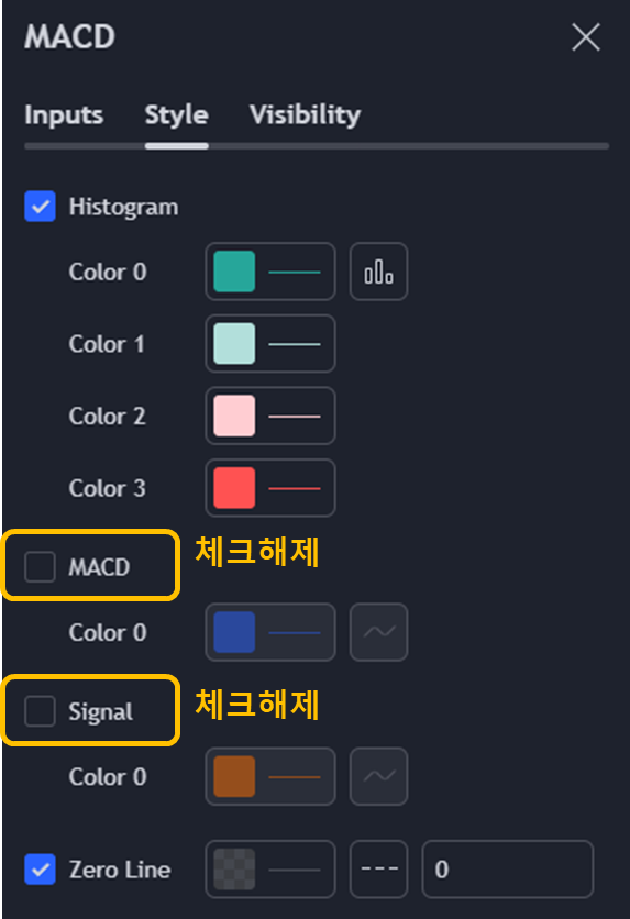 - MACD 설정(톱니바퀴모양)을 클릭하여 MACD와 Signal을 체크해제 해주세요