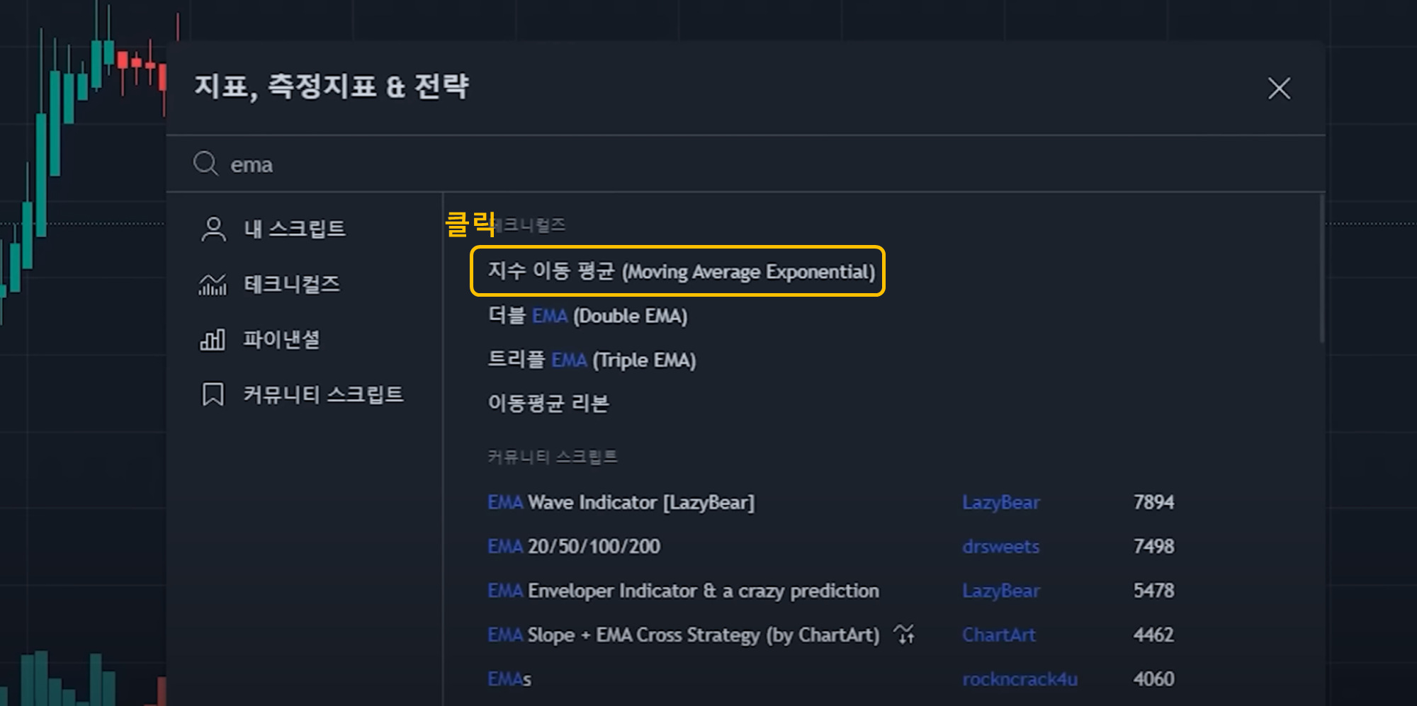 - 그 다음 아래와 같은 검색창에 'ema'를 검색하신 후 '지수 이동 평균(Moving Average Exponential)'을 클릭해주세요