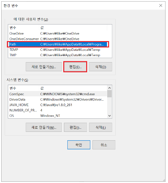 - 아래와 같이 Path 클릭 후 편집을 눌러주세요