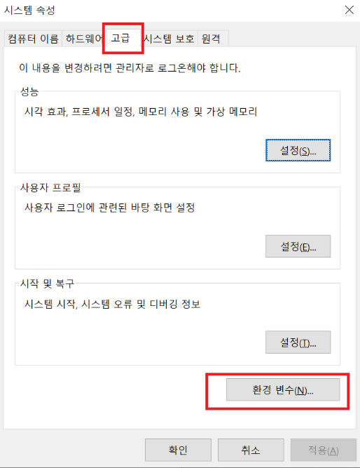 - "제어판" → "시스템 및 보안" → "시스템" → "고급 시스템 설정" → "환경 변수" 클릭